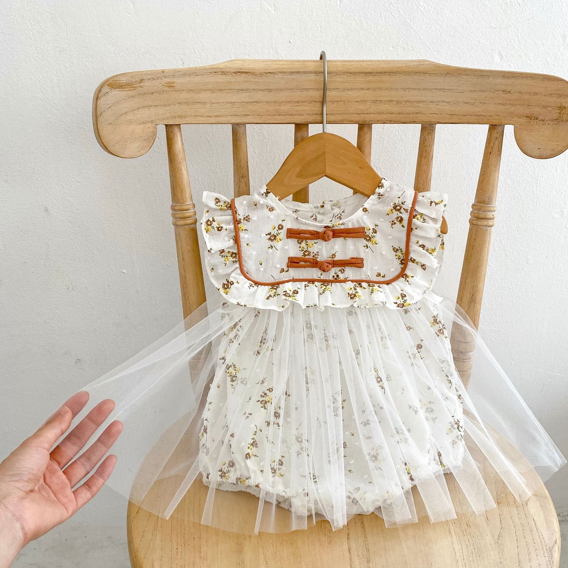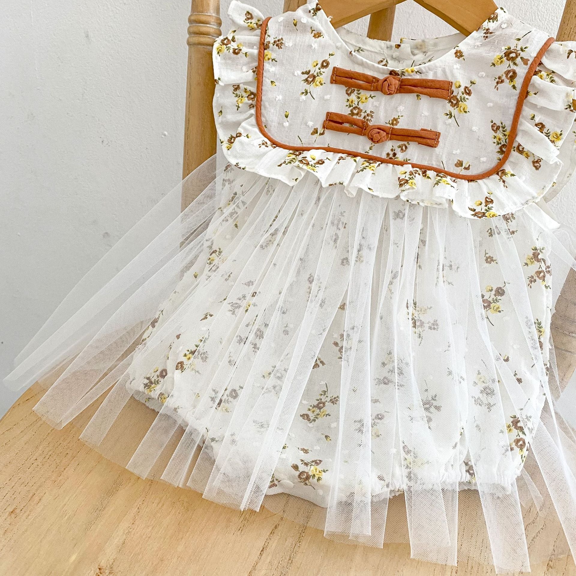 Baby Girl Flower Pattern Mesh Patched Design Sleeveless Onesies