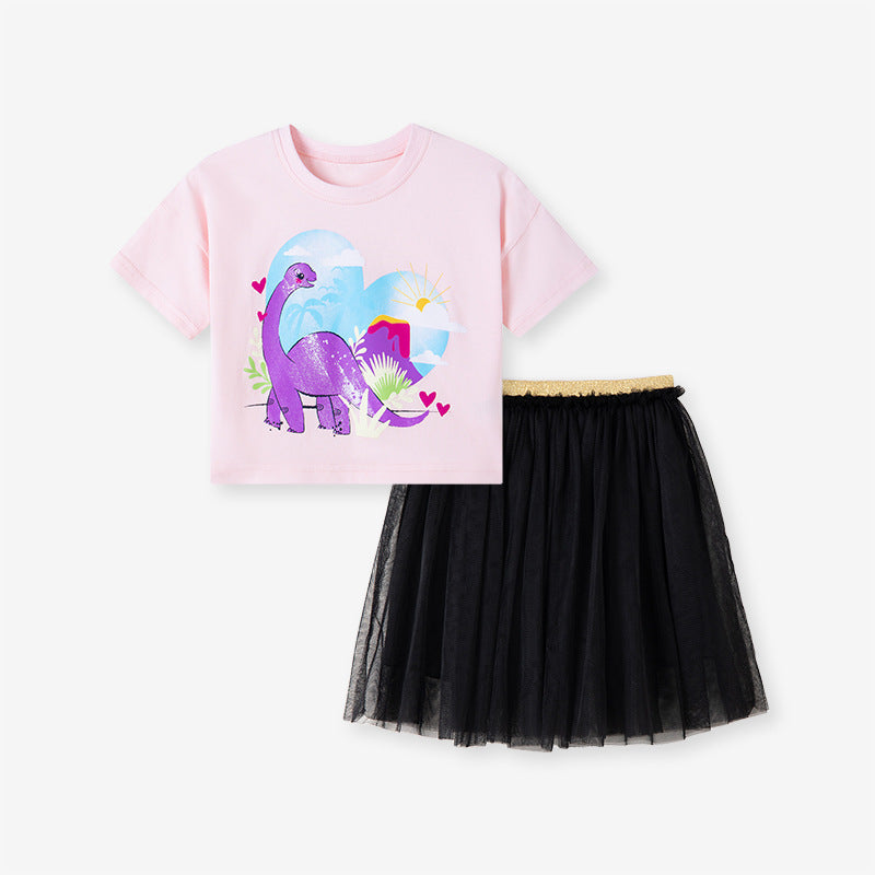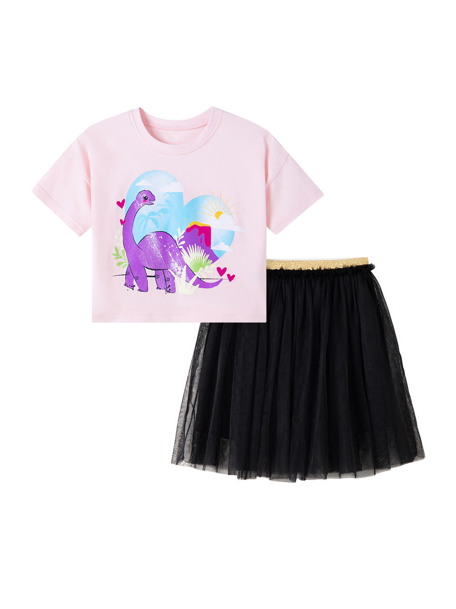 Summer Baby Girls Dinosaur Cartoon Pattern T-shirt and Mesh Skirt Clothing Set