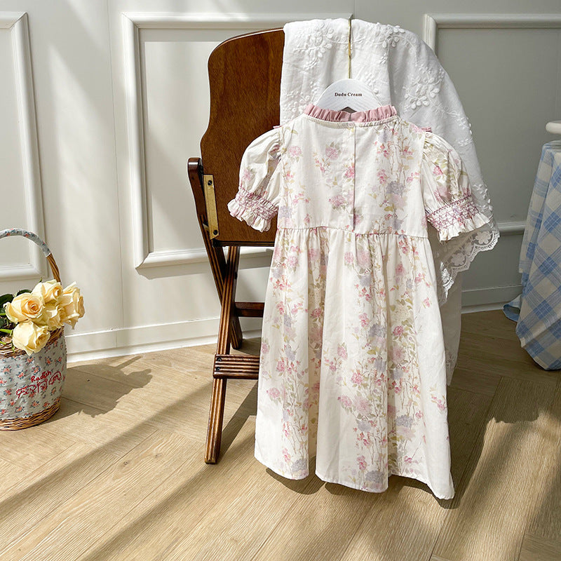 Summer Baby Kids Girls Short Sleeves Ruffle Neck Pink Floral Dress
