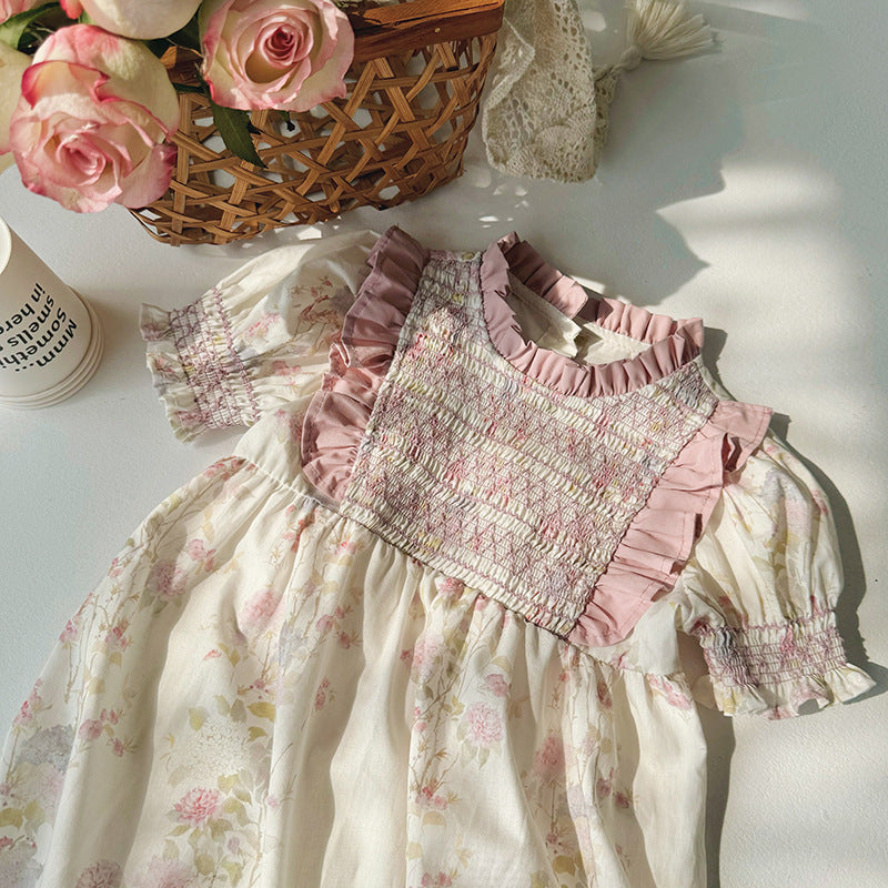 This charming pink floral dress brings a playful touch to your little girl's summer wardrobe. Featuring short sleeves and a delightful ruffle neck, it keeps her cool and stylish during sunny days. Lightweight and breezy, it’s perfect for playdates, family outings, or twirling in the sunshine.